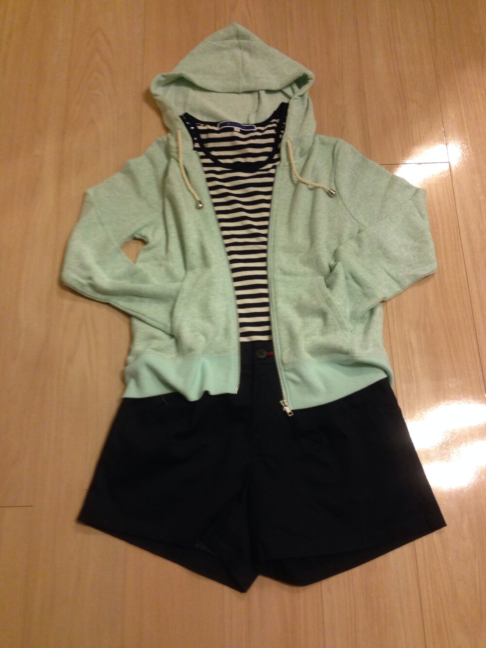 ミントグリーンのさわやかパーカーがポイント!!ショーパンならBBQなどのアウトドアにも動き安さ抜群☆暑くなったら脱げるパーカーは春アイテムの必需品o(^▽^)o