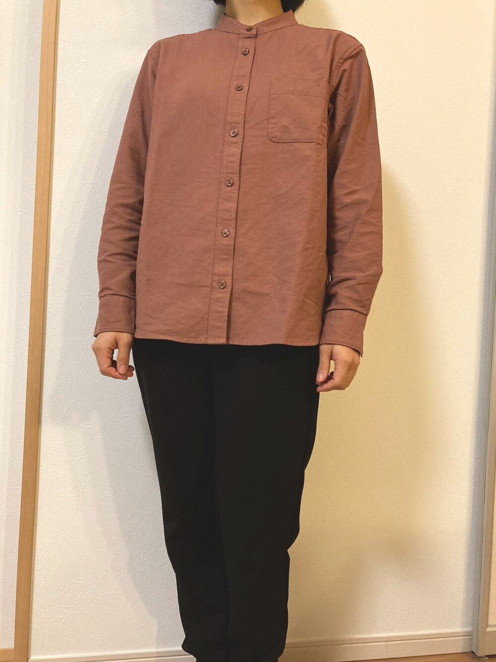 この間購入したシャツを着てみました。着やすくてデザインも気に入っています!寒いので上はチェスターコートを羽織りました。