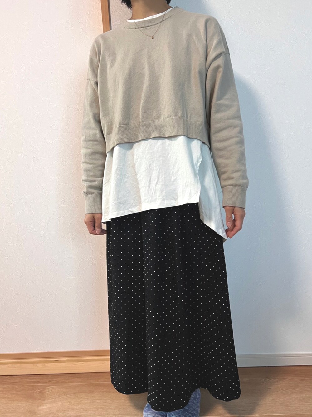 トップスは以前もアップしたもので、白のロンTと分けて着られるので他のものとも合わせられます。 ロンTの形が変わっているので少し個性的です。