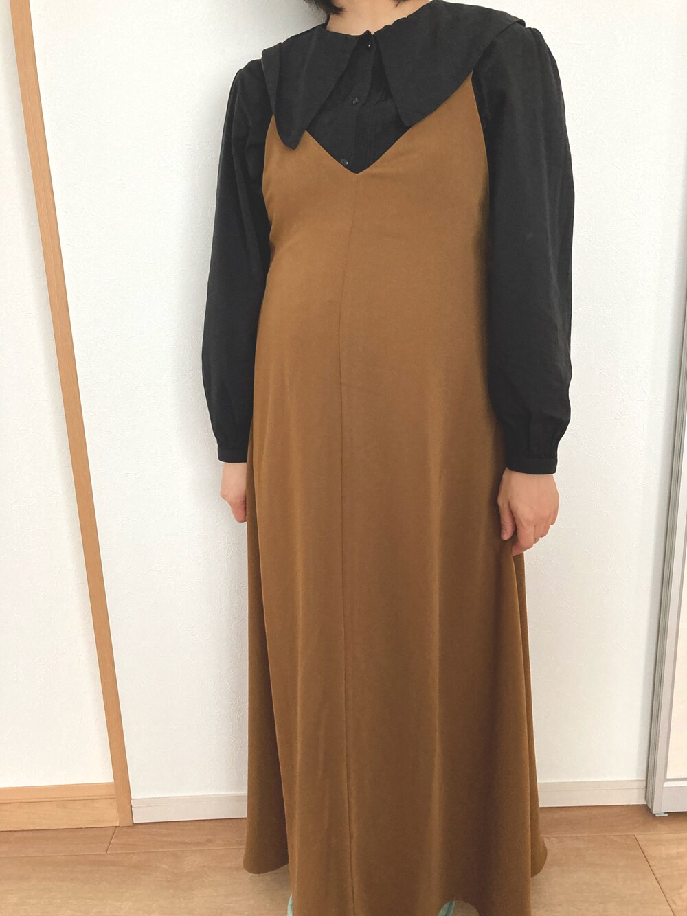 久々の黒ブラウス。襟が大きくても黒なので着やすいです。 キャミワンピは買ってから着ていなかったのですが、お腹周りがもうギリでした笑 次は産後に着たいと思います!