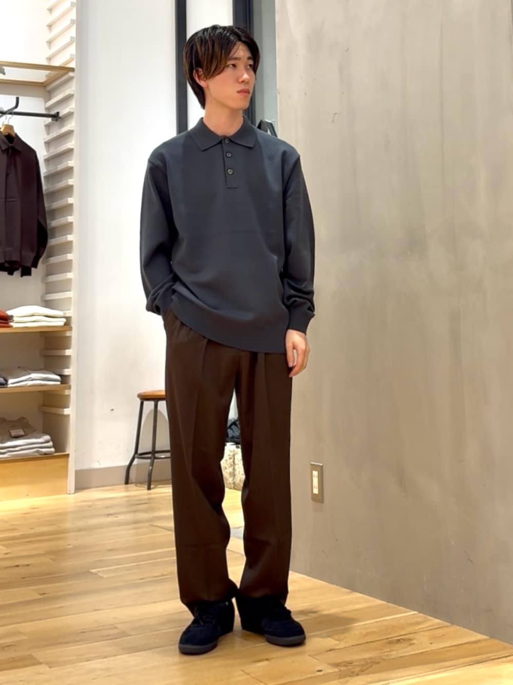 今回はUR TECH 200日ニットポロシャツ× UR TECH 完声2タックワイドトラウザーでキレイめコーデを組みました。 ブルーグリーンとブラウンの組み合わせがお気に入りのコーデ。 この組み合わせは気がつくといろんなアイテムでやっちゃいます。 タックインするとAラインシルエットでパンツのワイド感もしっかり感じられます。