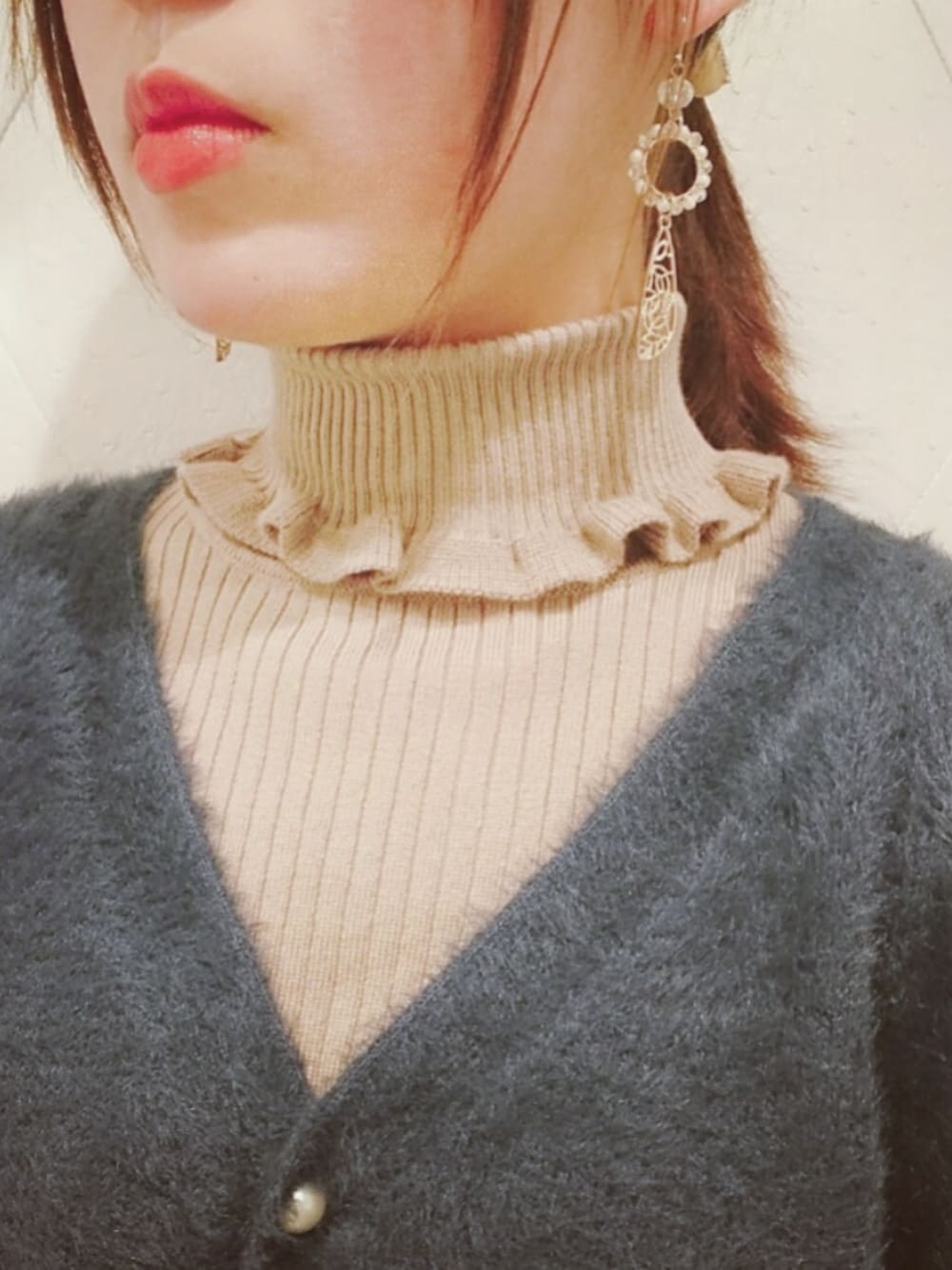 ピアスのパールとカーディガンのパールがポイント