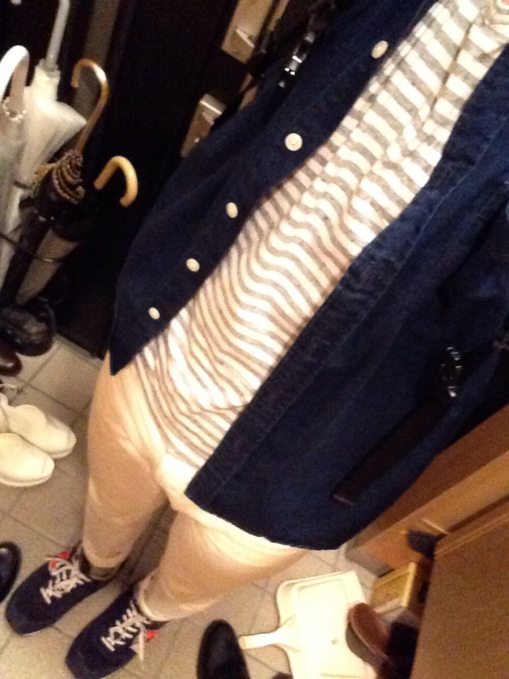 デニムシャツに 白のデニムスキニー スキニー好きにぃ(*^_^*)くぅー 雨に濡れた(*^_^*) 水も滴るいい男!くぅー
