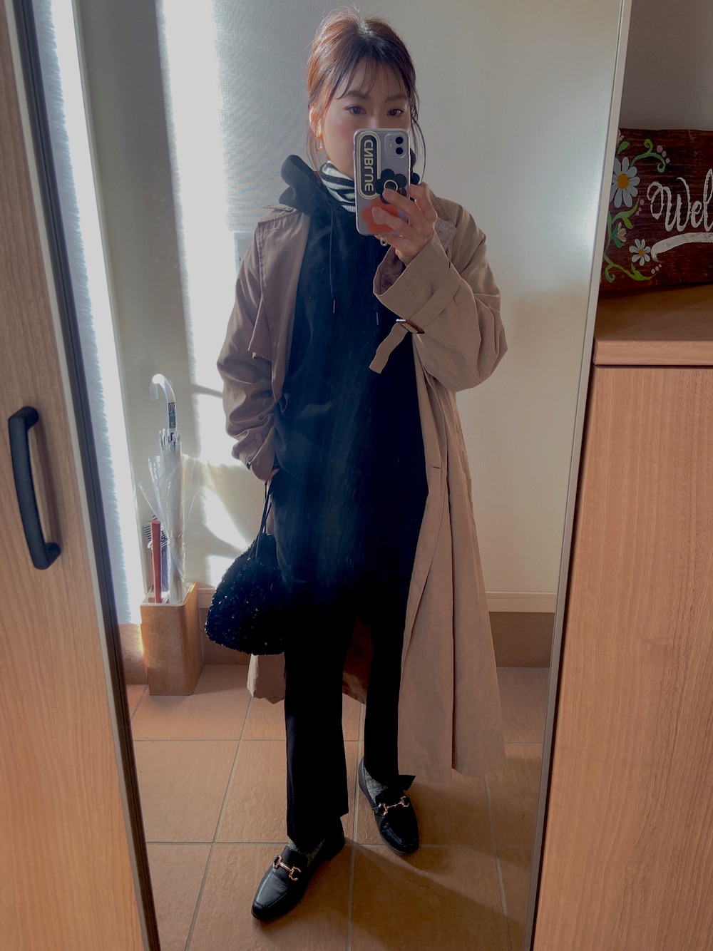 GUのプルオーバーパーカーの下にボーダーのタートルニットとスローブイエナのパンツでワントーンコーデ。 小物バッグはスパンコールにして同じ黒でも華やかさをプラスしました✨