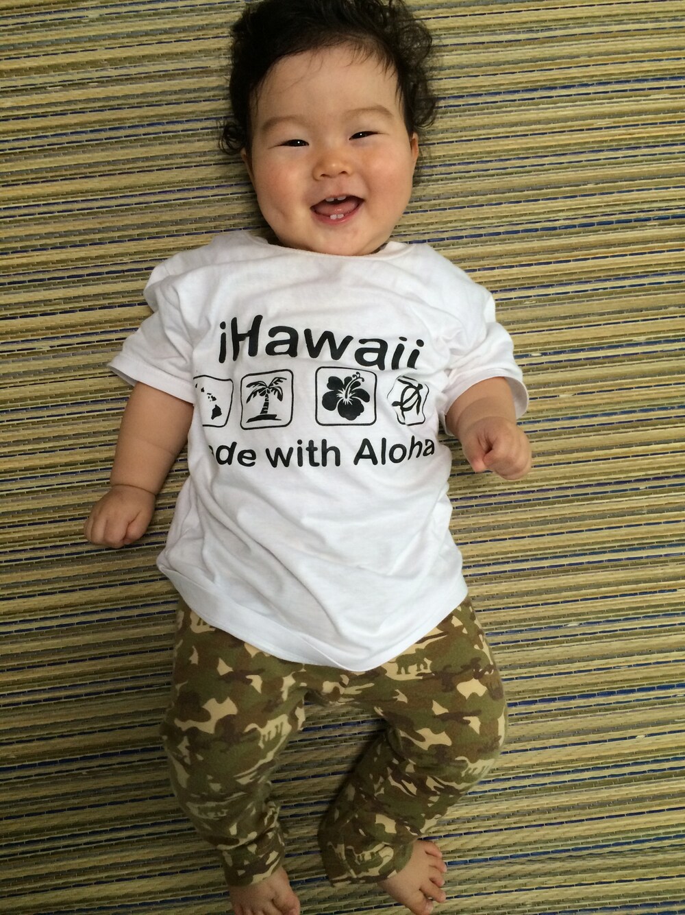 20150702 いつもパジャマにしてるHawaiiTをそのまま着替えずに着せてしまったよ〜 性別不明なスタイル👶🏻