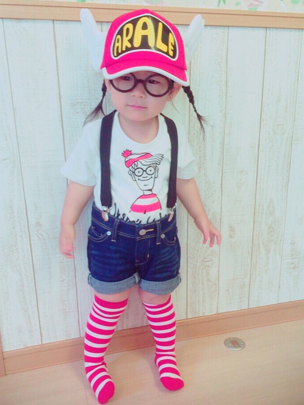 私も幼い頃よくしていたアラレちゃんの格好を娘にも‼︎ ウォーリーもプラスしてꗯ