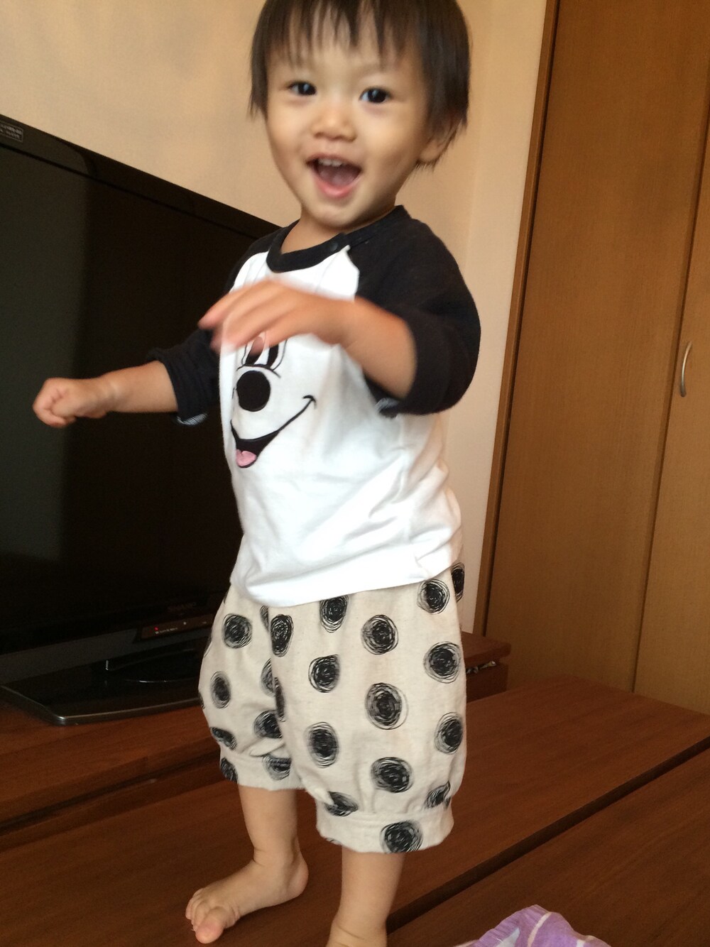 保育園コーデ。お気に入りのかぼちゃパンツは手作りサイトmimneで購入しました(*^^*)