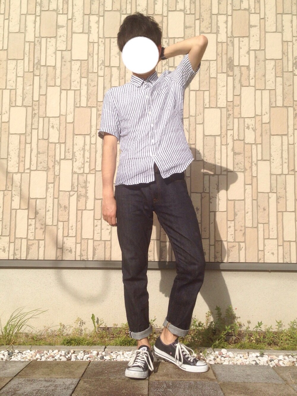 今日はそこまで気温上がらなかったけど、なんか蒸し暑かったので半袖です! ボトムスはユニクロのセルビッチジーンズ 裏地に赤耳があるので、自分はロールアップします(^o^)