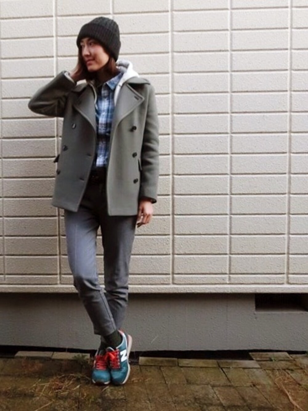 寒いならば もういっそのこと 雪降って! グレー上下に同系の青いチェックシャツを差し色にしました。