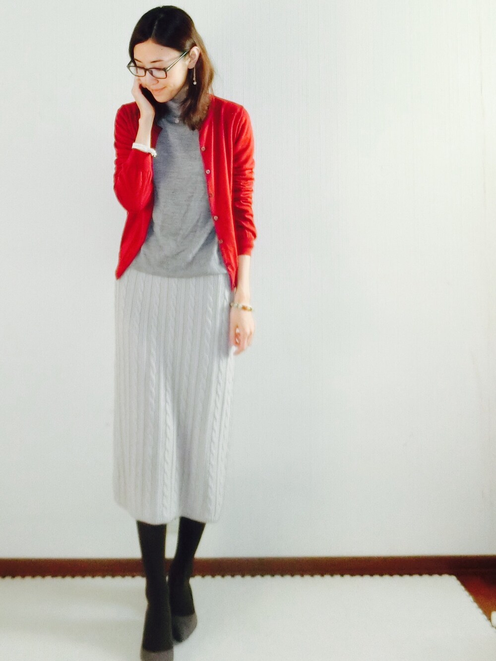 こんばんは グレー×レッド この色の組み合わせって すごく冬!❄️って感じするんだなぁ🙎と感じました。 タイツはこげ茶です☕️
