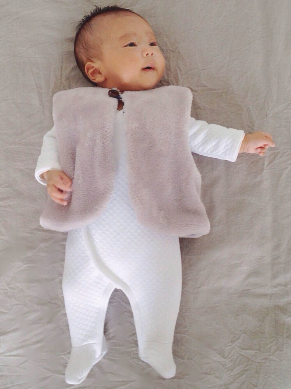 白いキルティングのカバーオール✨ 着れるのもあと少かなぁ〜。 ちょっと前まではまだ大きい?って思ってたのに、babyの成長はホントすごいスピードですね🚼 ベストは妊娠中に通ってた洋裁教室で作ったハンドメイドです(^-^) 自分で作ったお洋服着せれるなんてhappy❤︎自己満です〜💦 最後までお付き合いありがとうございます♡
