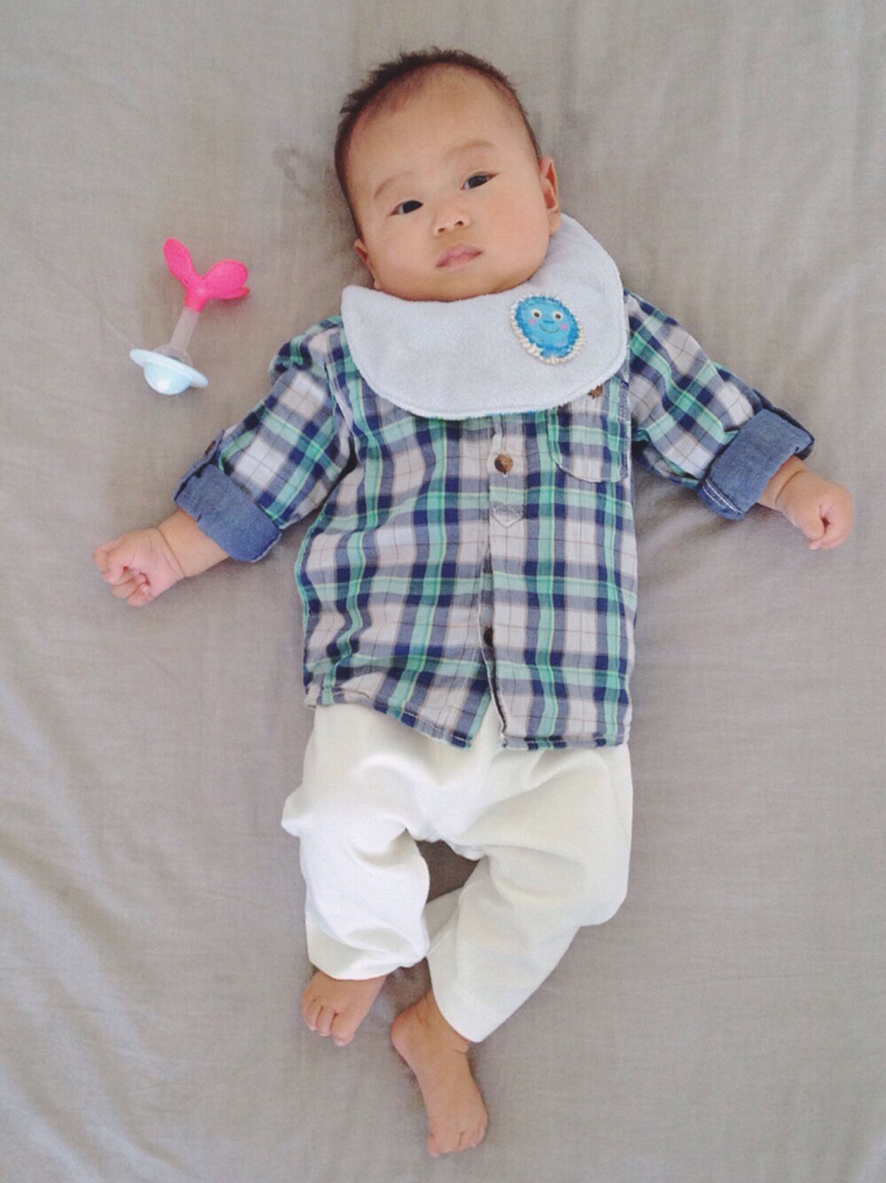 Thank you for coming to my page☺︎❤︎ チェックシャツ➕白パンで 爽やかコーデにしてみましたぁ。 暑がりbabyさん 靴下ナシの裸足ですー💧