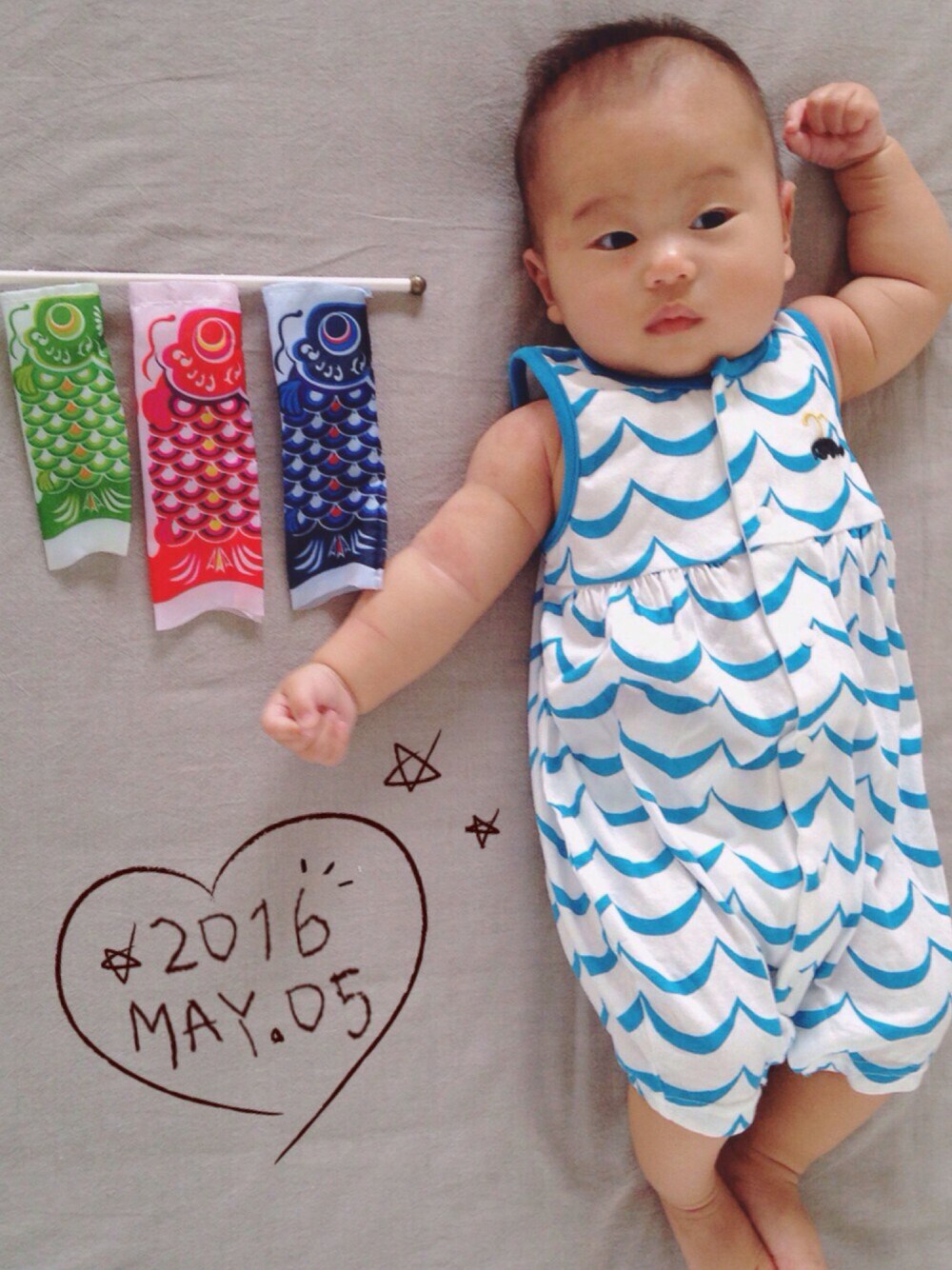Thank you for coming to my page☺︎❤︎ babyさん初節句🎏なので、 鯉のぼり風ロンパースです✨ しかし腕がムチムチ過ぎるー💦 すくすく成長中です😆💕
