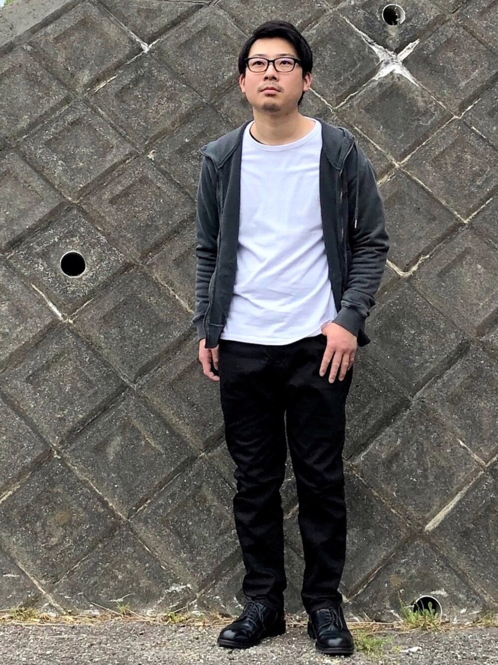体温調整しやすいジップパーカーを羽織りに ポイントは革靴で部屋着感を和らげ、 ブラックデニムとの合わせで脚長効果を狙う。