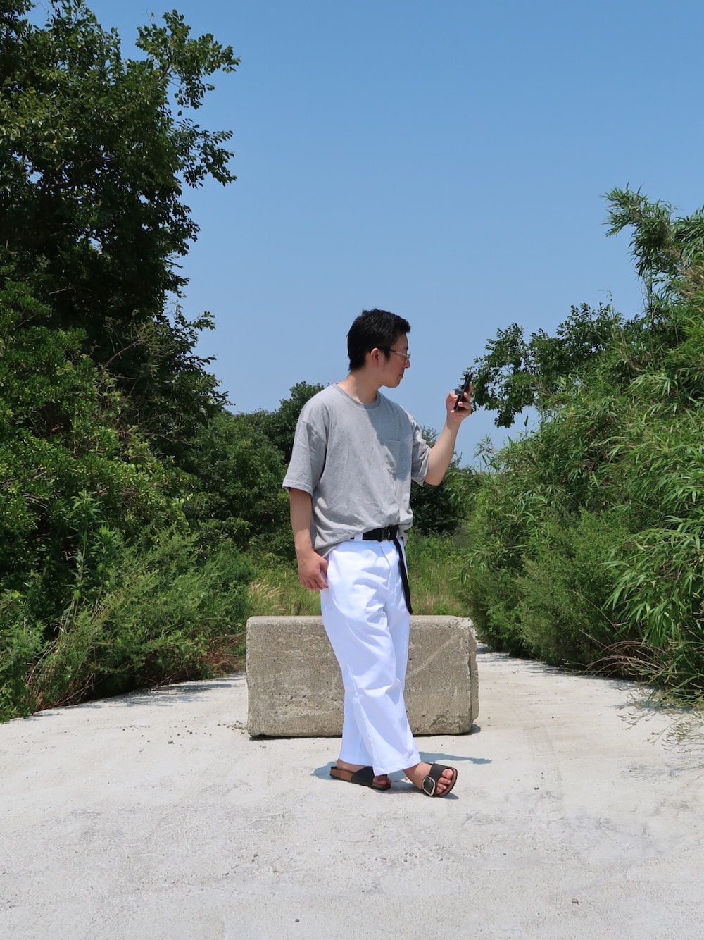 カラッと暑い日曜日は白パンで、色味だけでも涼しく このTシャツは汗っかきにオススメで、汗染みがない。 女性もできるコーデになっておりやす。