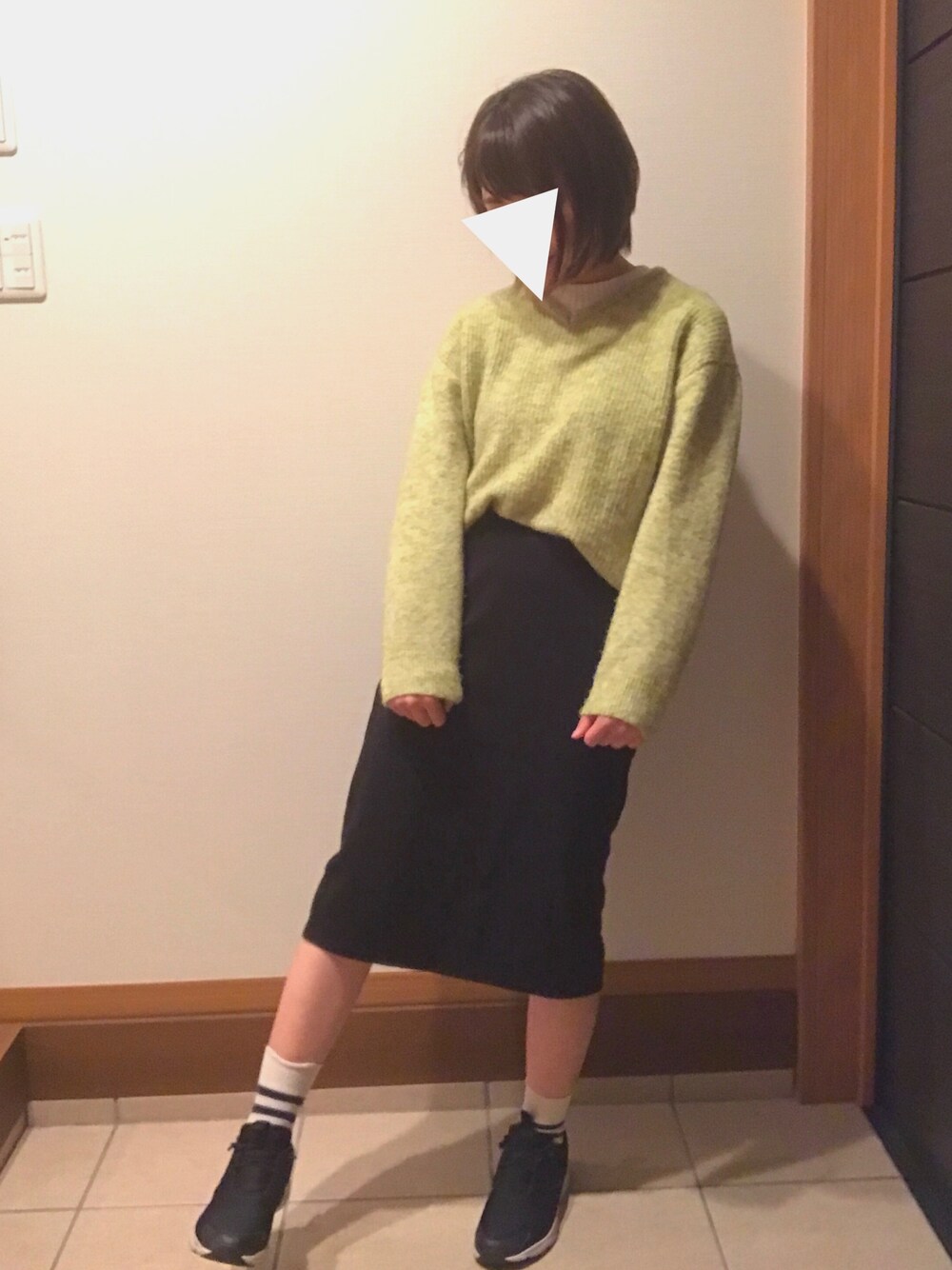 こんばんは 最近、髪を切ったのでバランスが大分取りやすくなりました🙌 今日は寒かったのでニットを。。 季節感は出したかったので春色のニットにしました🌳 インナー、ソックス、イヤリングで白を足して すっきり見えるよう3色に収めてみました🐶