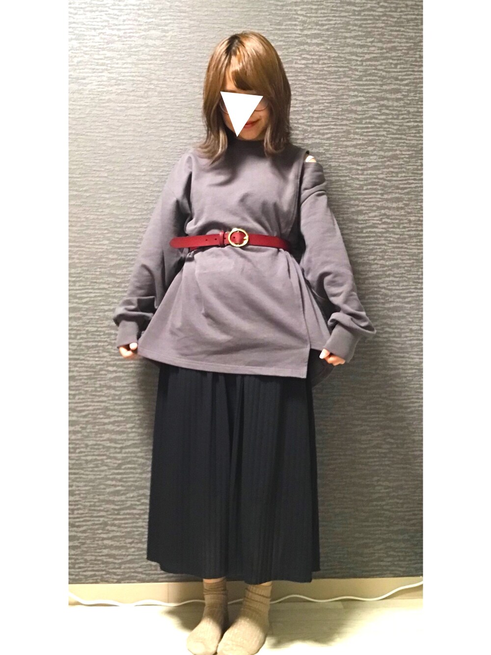 ワンショルダーでくすんだグレーのロンT 見つけて一目惚れ🥰 スカートも福袋に入ってたwclosetの プリーツスカートで 上下wcloset💓