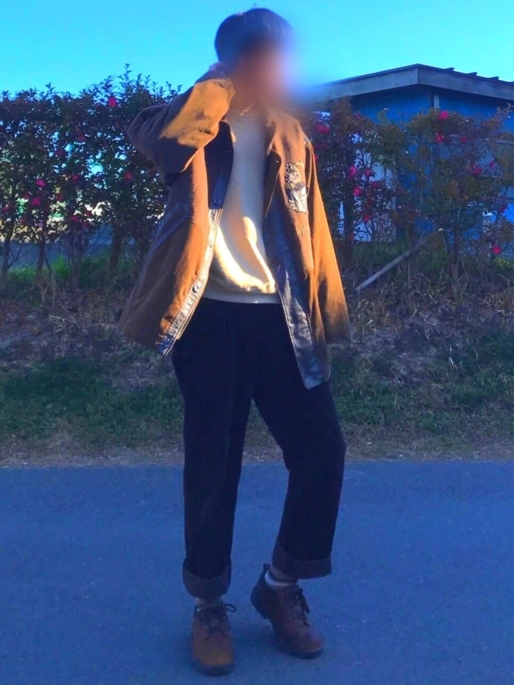 拝見してくださりありがとうございます☺️ まだまだ寒くて春の先取りとか言ってる余裕がありませんwww 今回はブラウンにまとめました! パンツは茶色のコーデュロイなんですけど、 日陰で撮ったせいで 明るさと彩度上げてようやくこれwww アウターは古着屋さんで犬の刺繍に一目惚れして購入しました💕 サイズは4Lなんですけど、僕が着てもオーバーサイズですww 【余談】 ストーブの近くにいたら制服の両膝が焦げ て穴が空いたので修理に出しましたww よかったら フォロー、いいね、よろしくお願いします🙇
