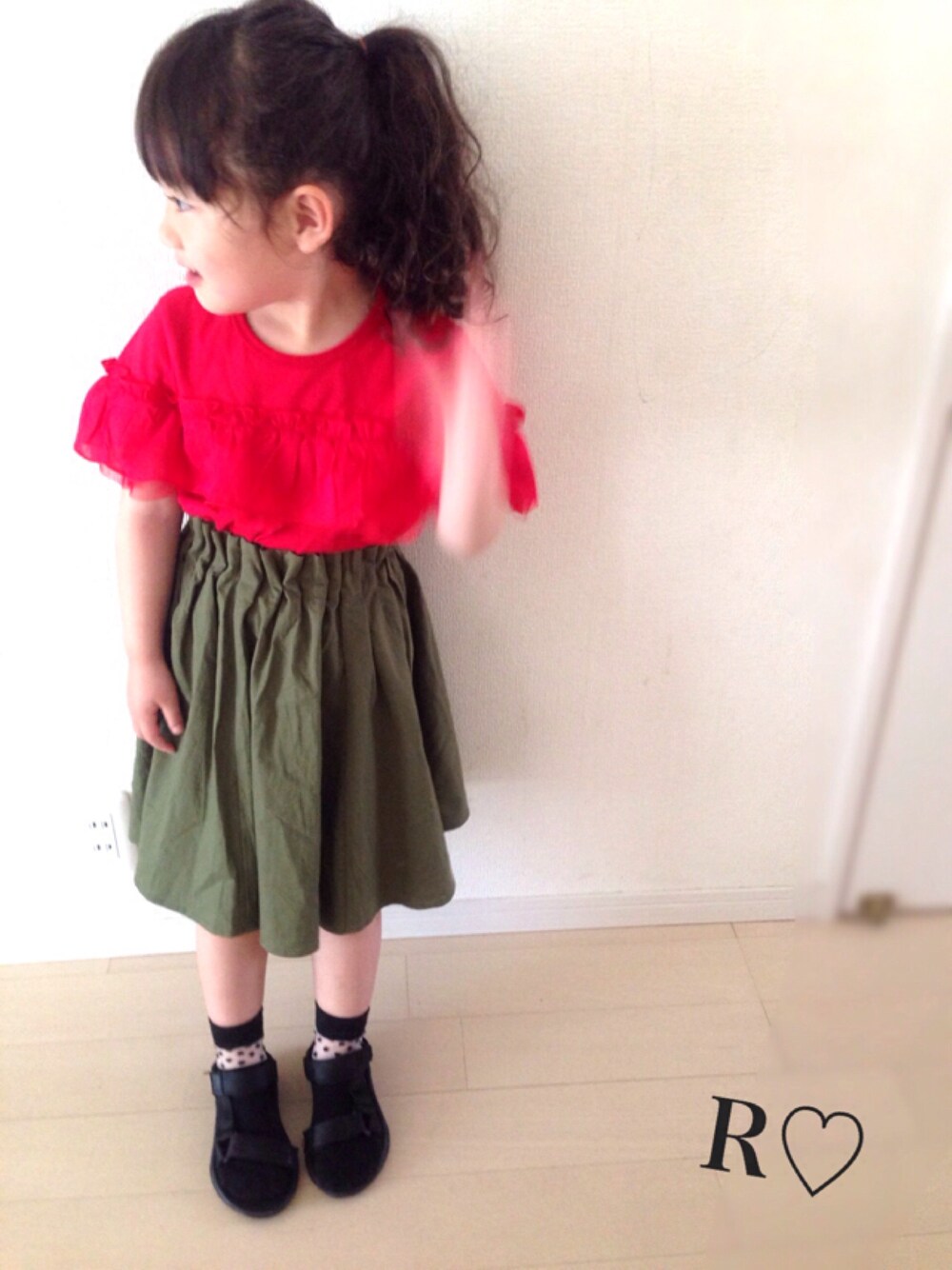娘コーデ♡ 兄とリンクしてます😁 赤×カーキ結構好きかもー