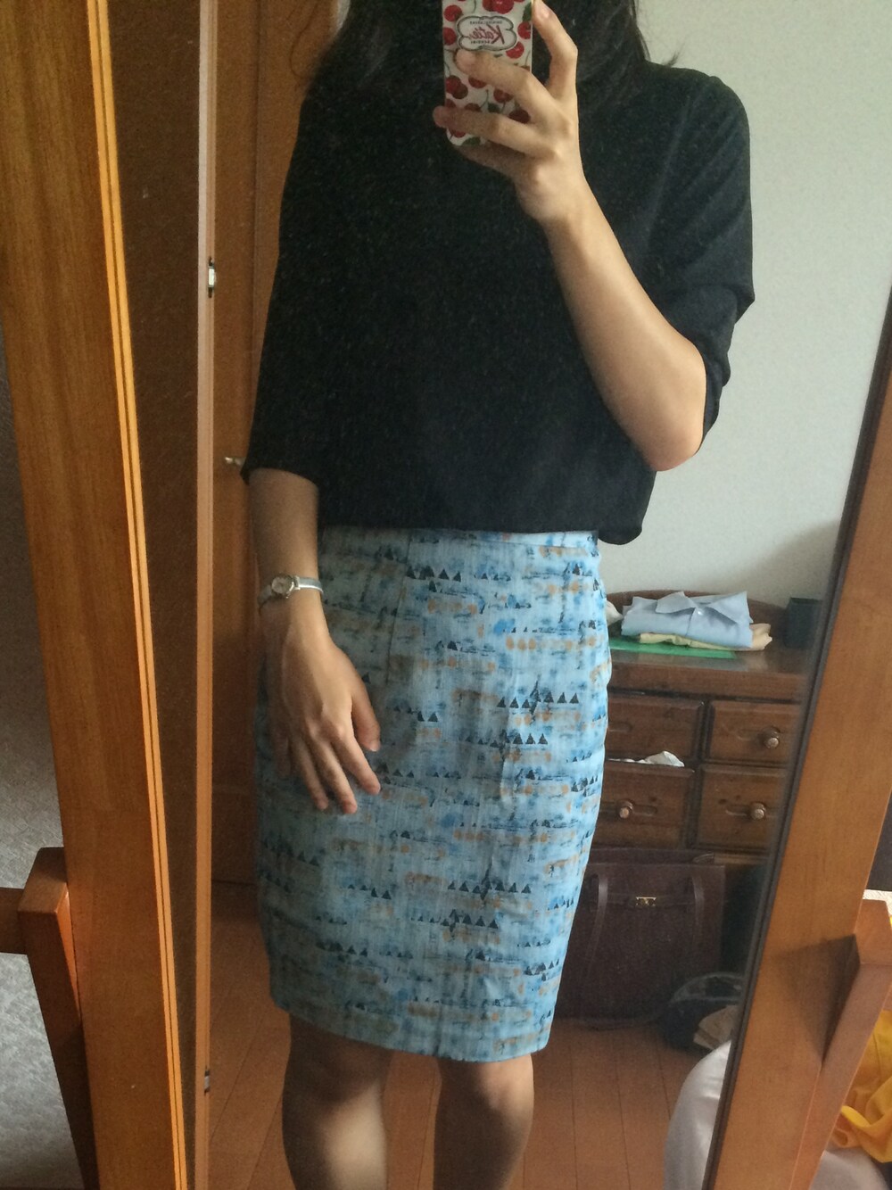 トップス、スカートともに韓国で購入! 幾何学柄のデニムスカートを活かしたコーデ! 時計はマークです!