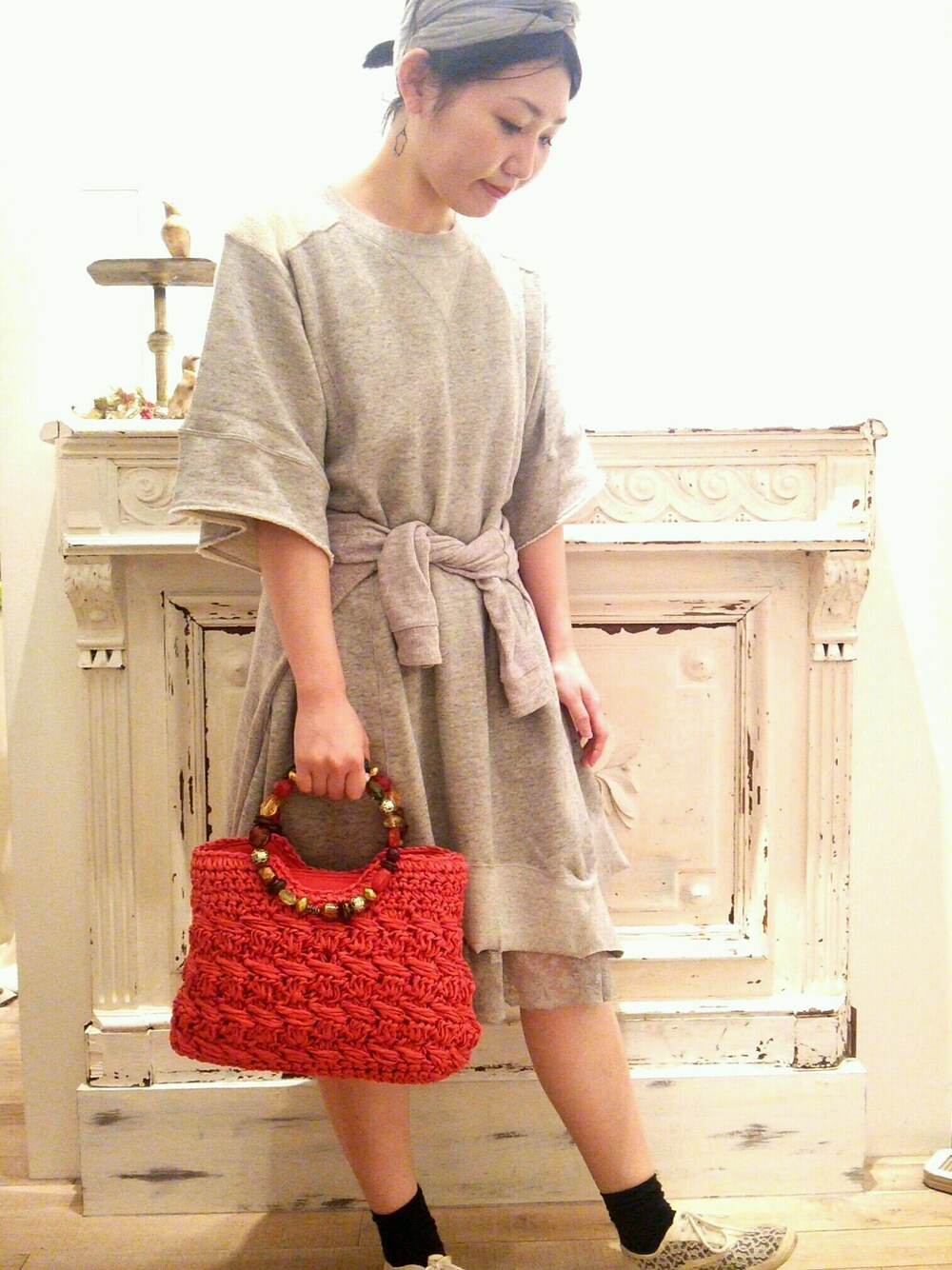 ゆったり着れる裏毛のワンピースは動きやすく、春夏のおでかけに、おすすめです。 ワンポイントで赤のカゴバッグを合わせると、同系色のコーディネートも締まります。