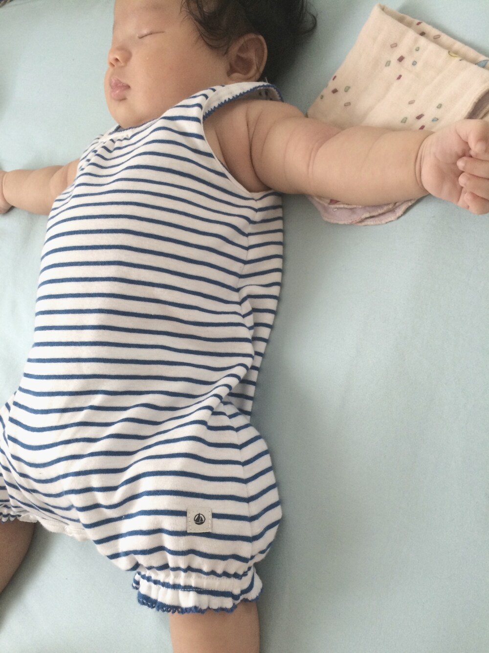 昨日のコーディネート♡ 暑すぎるのでプチバトーのロンパース1枚で✨ ガーゼは、お気に入りのPG GAUZE♡ すごい柔らかくて、色々な可愛い柄があります✨