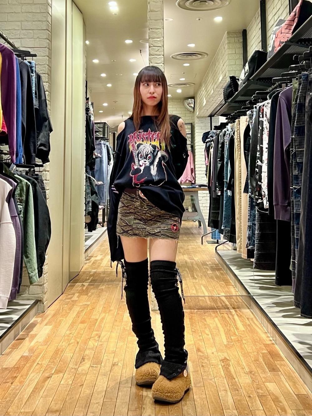 RINA(HYSTERIC GLAMOURラゾーナ川崎プラザ店)のスカート「NOISE PATCH ミリタリーローライズミニスカート」を使ったコーディネート