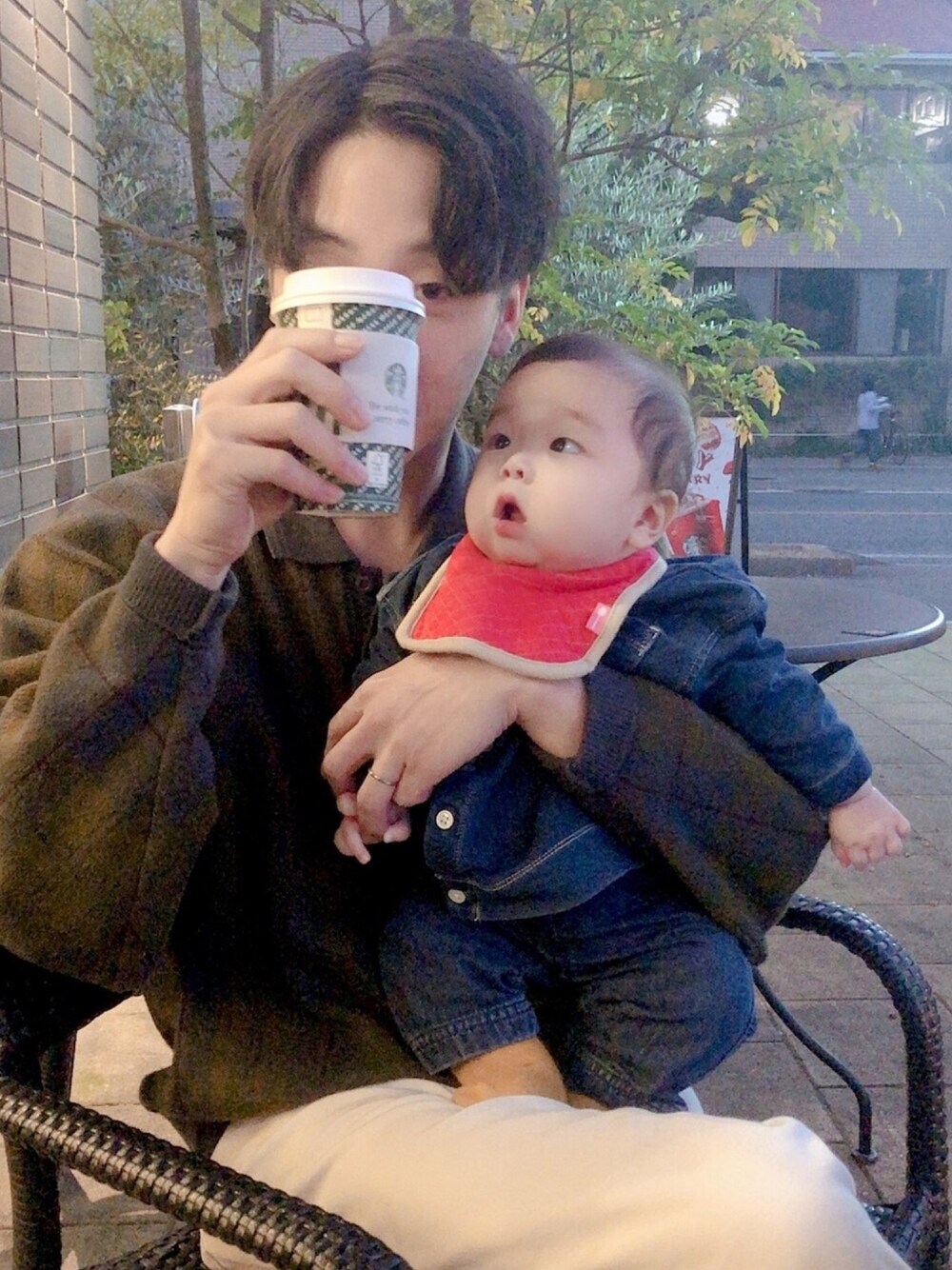 昨日はパパがお休みだったのでちょこっとお出かけしました🥰 デニムのノーカラーシャツとボトムを合わせてカジュアルに🌟 からし色のソックスを差し色にしました🐛