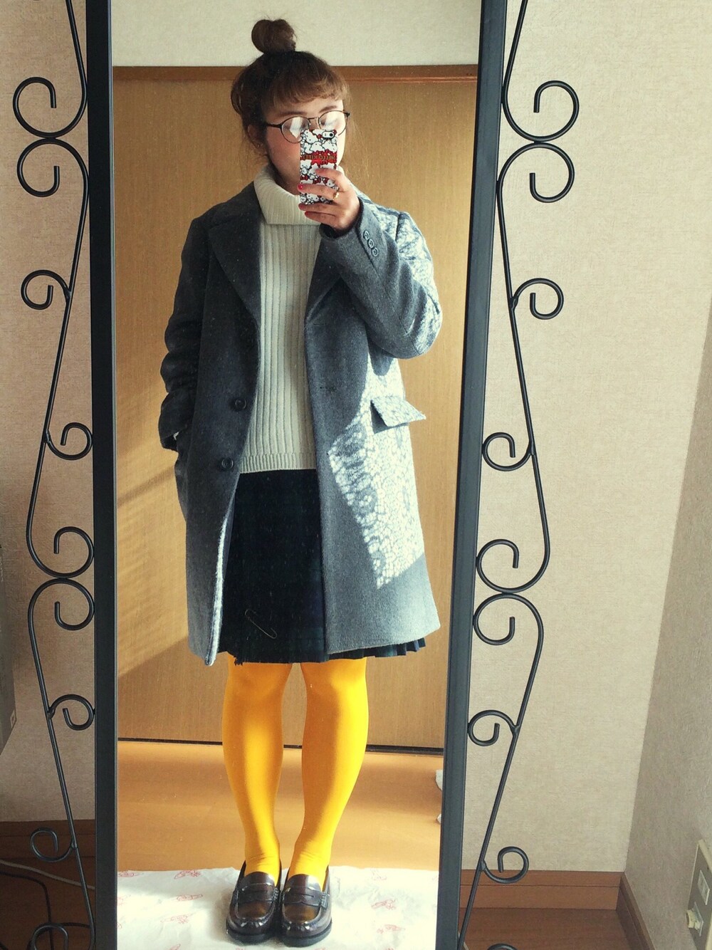コート:GU タートル:GU スカート:古着 シューズ:HARUTA