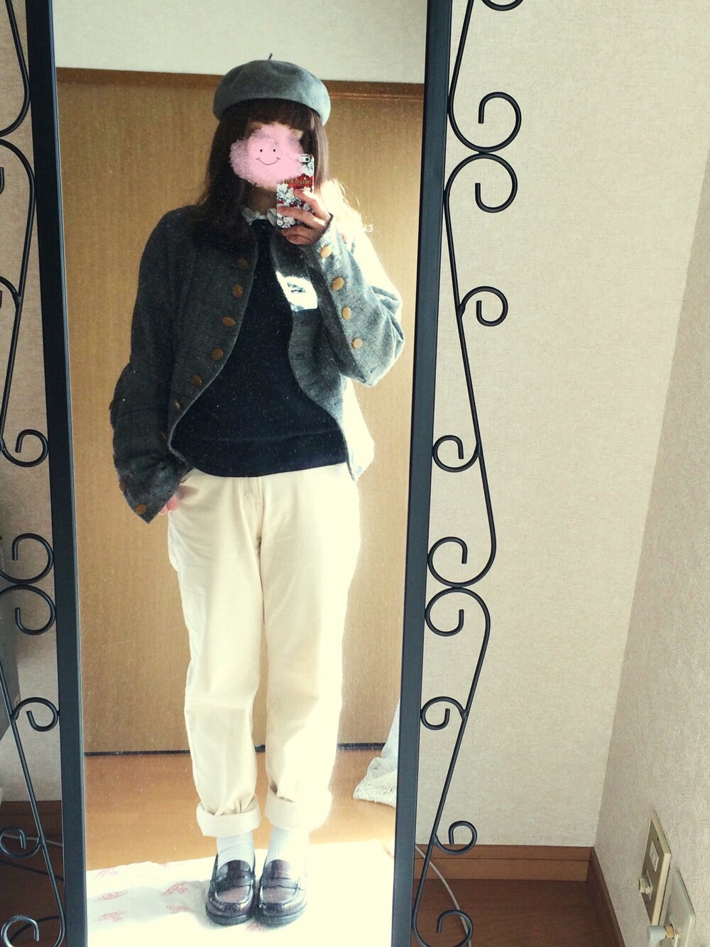 帽子:もらいもの ジャケット:Vivienne Westwood ブラウス:BEAMS BOY トレーナー:UNIQLO パンツ:w closet シューズ:HARUTA