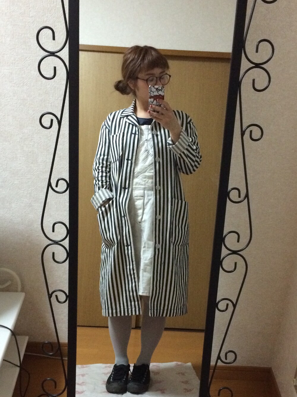 メガネ:BEAMS ジャケット:rivet&surge サロペット:BEAMS BOY シューズ:MUJI