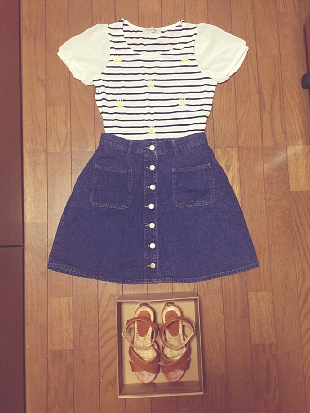 トップスは数年前にAunt Marie'sで購入したもの、スカートはmeJane、サンダルはsangoです。 トップスのマーガレットの刺繍がお気に入りです(^_^)