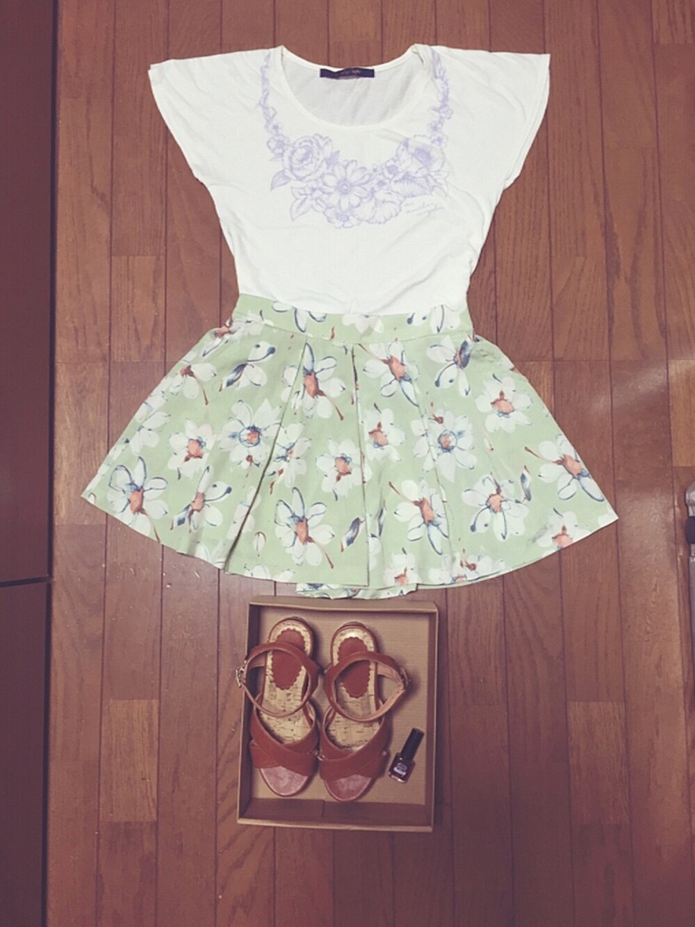 トップスの花の首飾りみたいなプリントがとても気に入っています。いっぱい着てるからだいぶヨレヨレになってきてしまった( ; ; ) このキュロットは独特な色と柄であんまり合わせられる服がないです...笑 マニキュア(キャンドゥ)はベリー系カラーのクリアタイプで、簡単にグラデーションができてとても可愛いのです...!