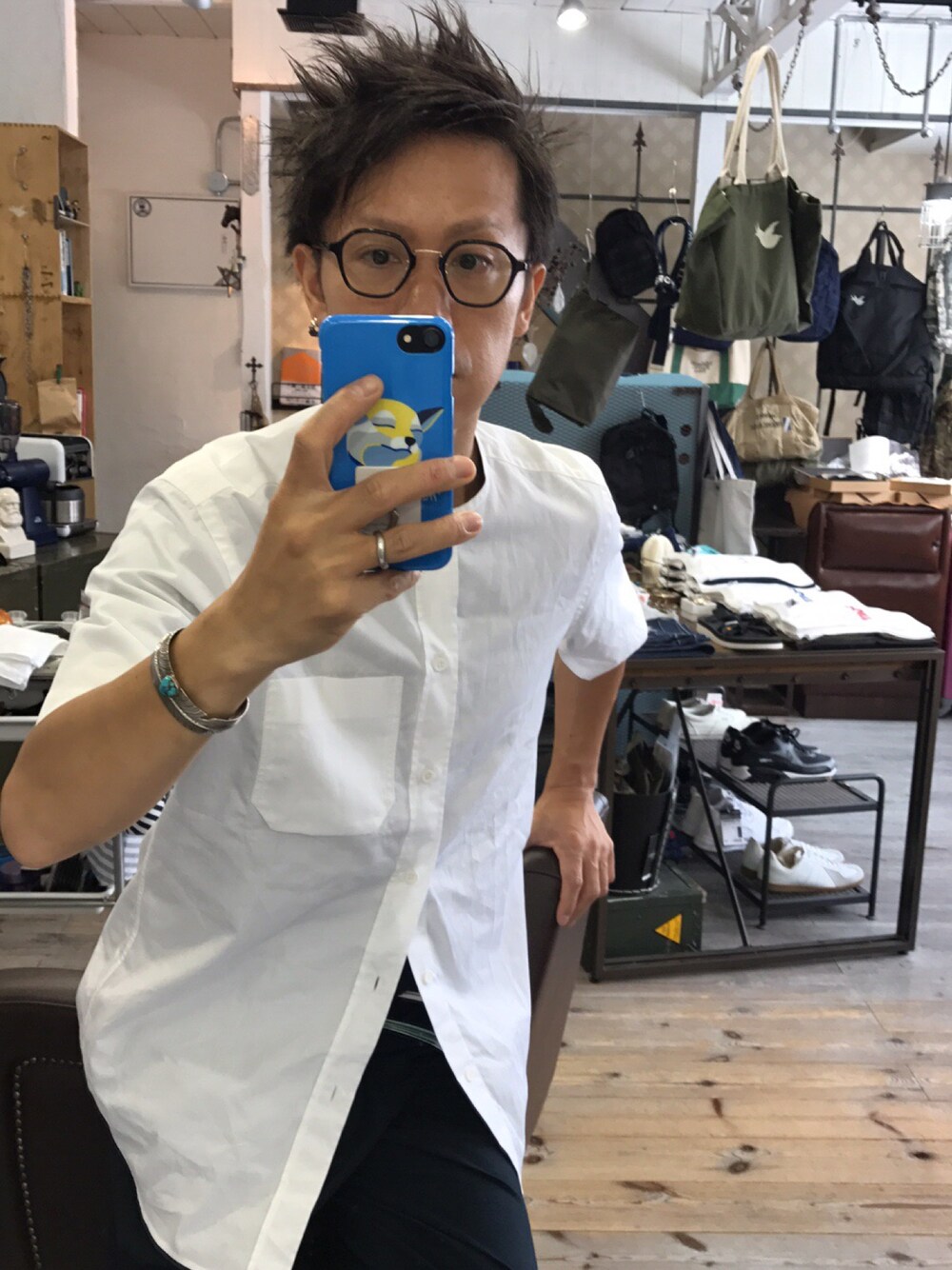 バックデザインがちょーお気に入りのOAMCのノーカラーシャツ✨ 今日はワイドパンツにアヤメガネで休日のドクタースタイル👨‍⚕️