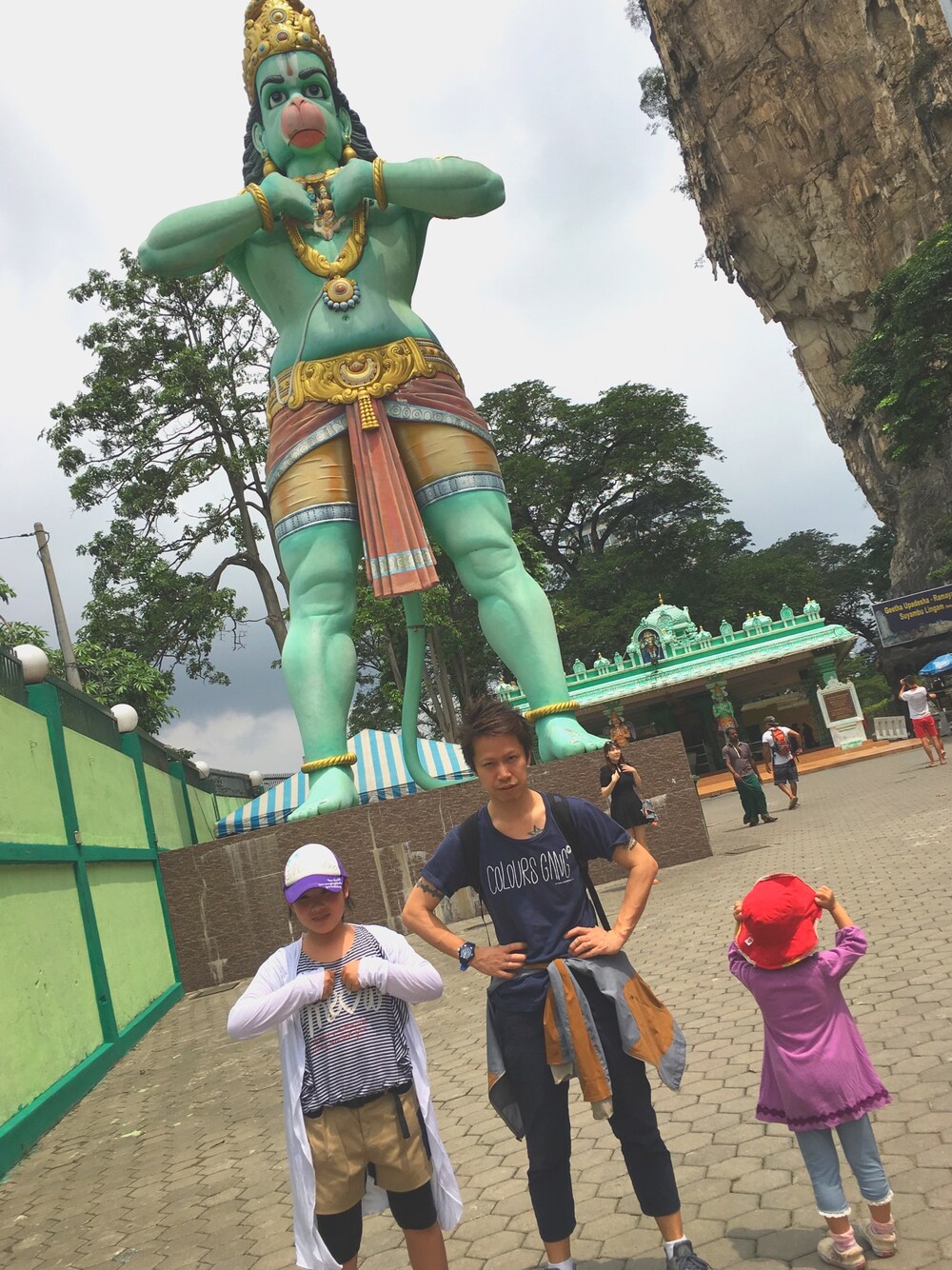 マレーシアのパワースポットBATU CAVESの前で(^◇^) 階段270段登る筋トレの格好で!