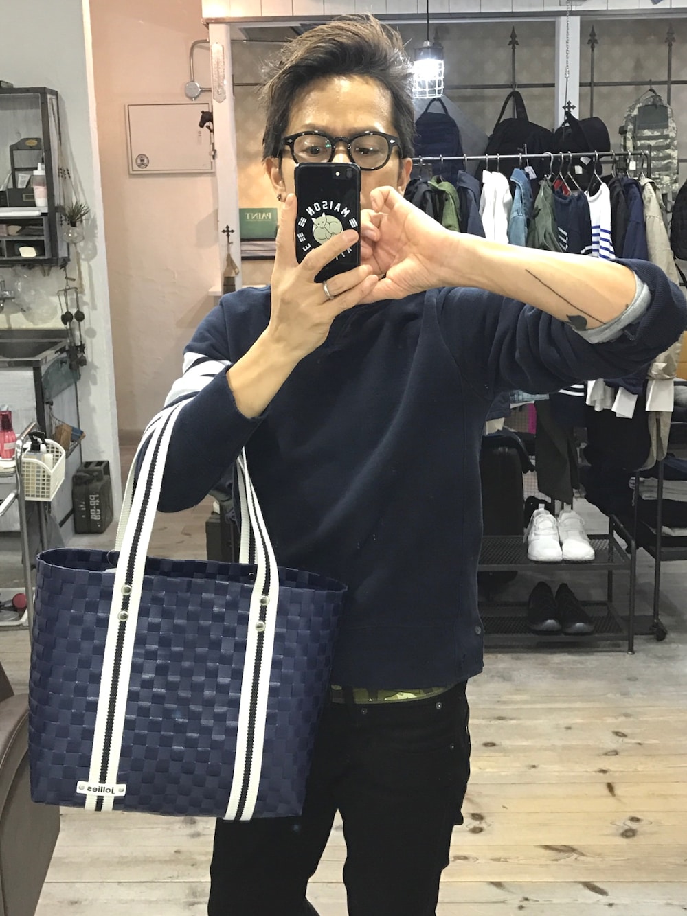 ダメージスウェットはトムブラウンできれいめカジュアル😁全体のコーデに合わせてトートバックもネイビーに✨入荷したばかりの新作をみると春夏が待ち遠しくなります(^○^)