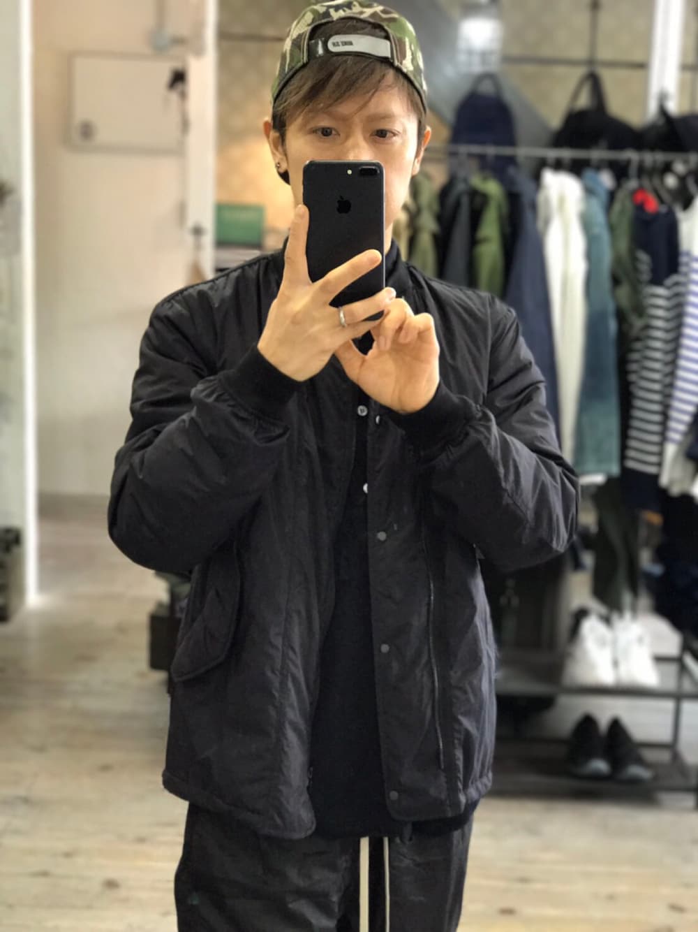 春らしいハーフサルエルパンツにナイロンジャケットっていうスポーツミックスのストリートの鉄板スタイリング✨真っ黒なので、プリンスのテニス靴下とナイキのカモキャップでワンポイント色を加えて^ - ^