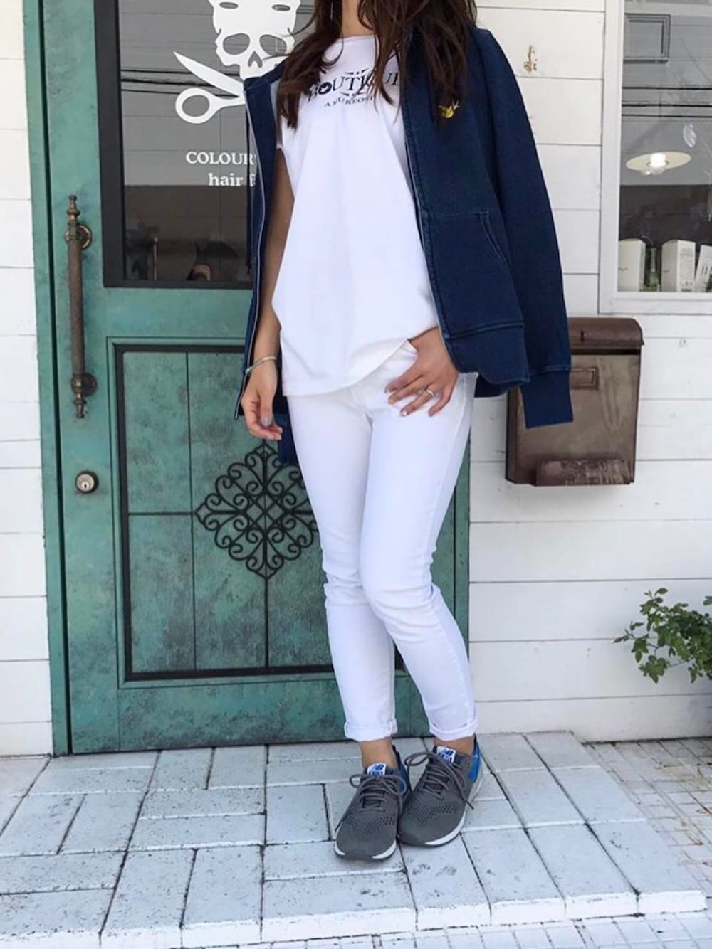 ホワイトを基調にした清潔感の爽やかなコーディネート✨ リゾート感の漂う白をスニーカーで都会っぽく☺️