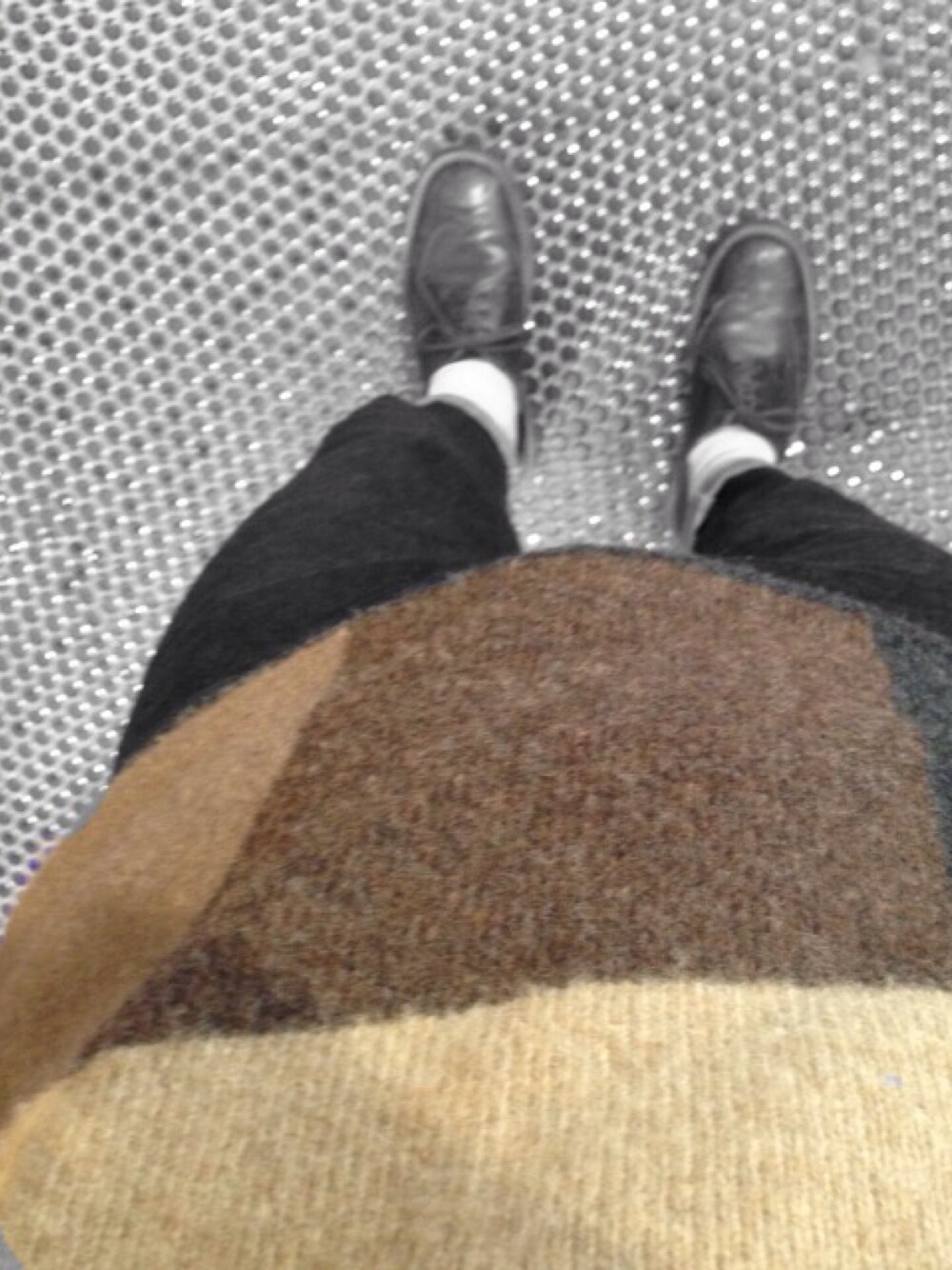ブラウン系のニット/セーターを着用したメンズの秋コーディネートの1枚目の写真