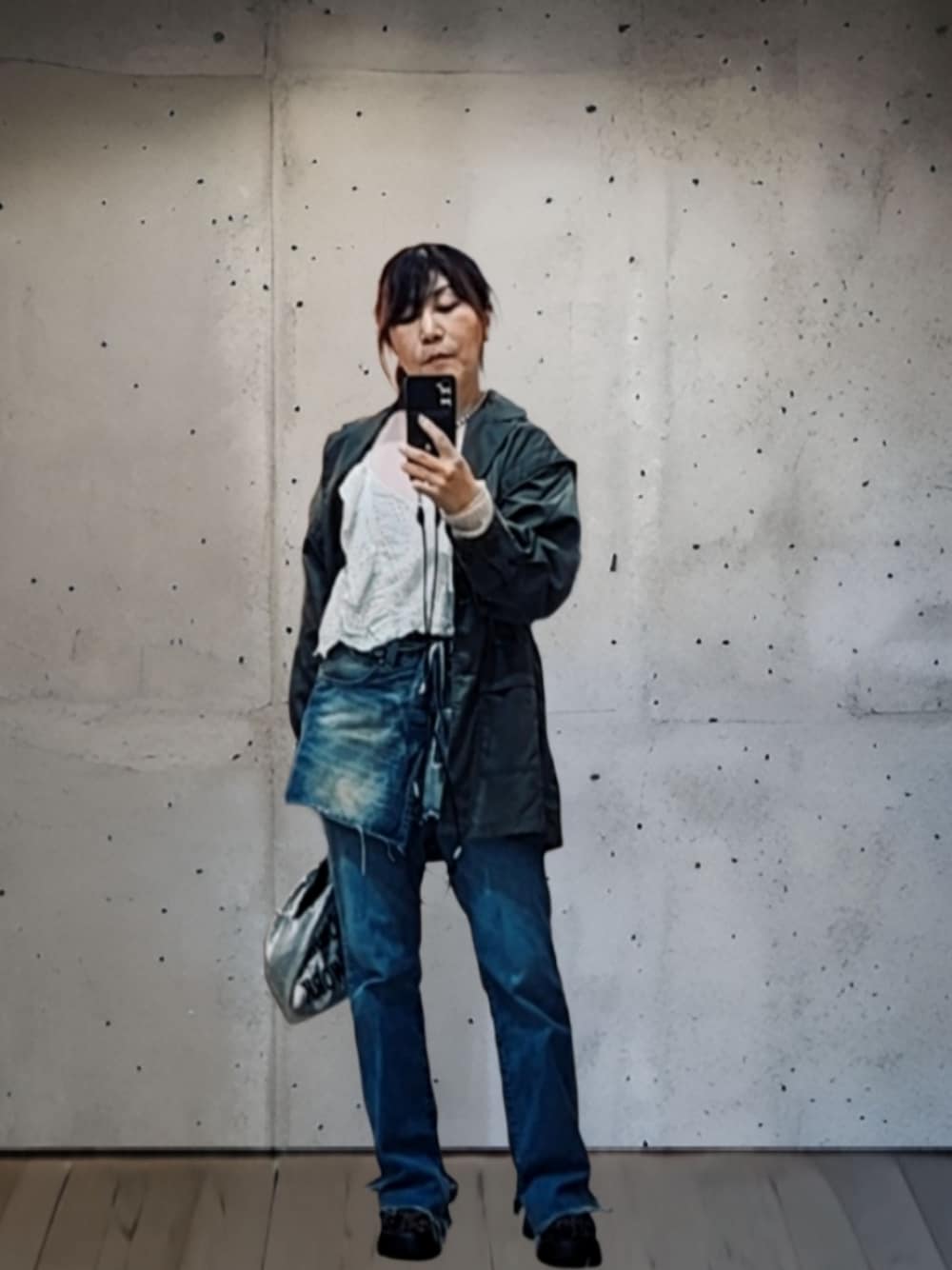 カーキのナイロンジャケットのメンズっぽい物に 敢えて超甘々のレースのビスチェを合わせてみました👌 ̖́- ボトムスにも女性らしさをプラスするためにデニムのラップスカートをチョイス✨ いい感じにまとまりました😉