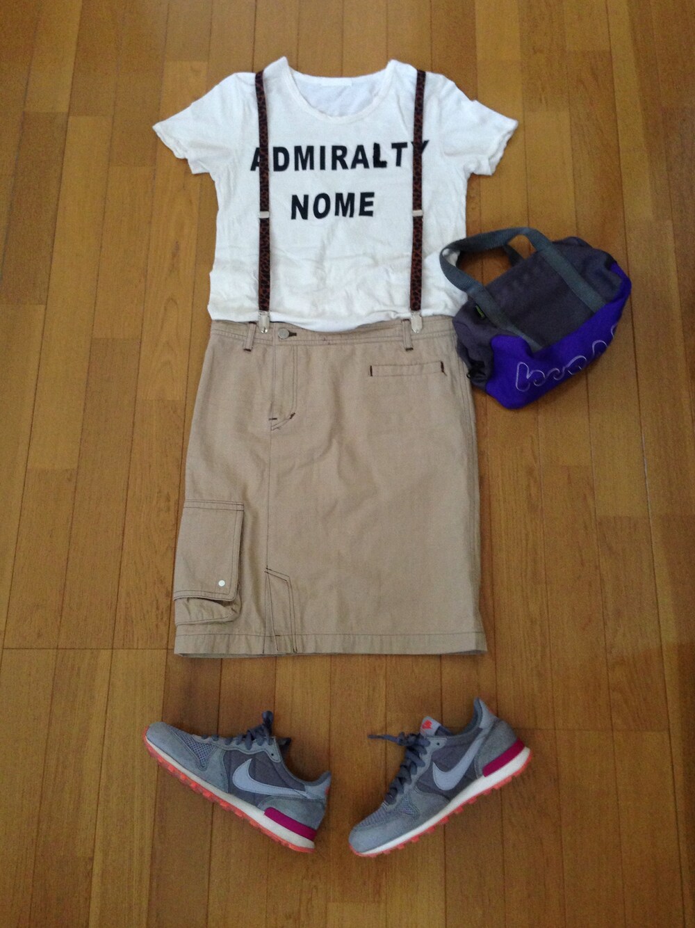ちょっとそこまでコーデ^ ^ スカートはまだ若い頃に購入したものだけど、結構タイトで、これくらいの歳になってからのが色々と合わせやすくなったかも。 最初はサスペンダー無しで着てたけど、ちょっと淋しかったのでサスペンダー買い足しました。 GUのセールで300円!