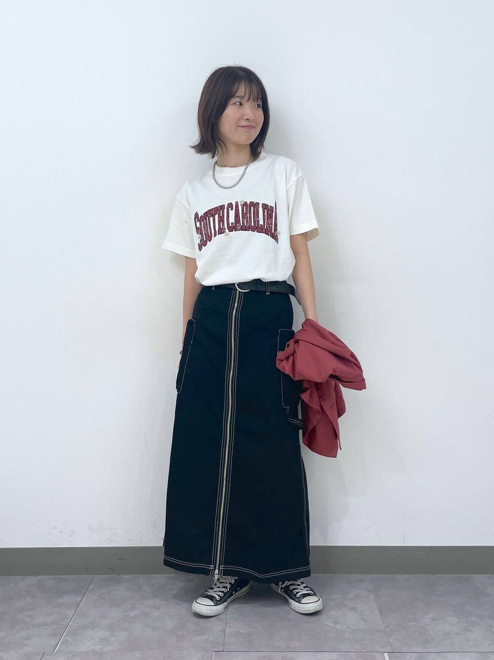 【トップス】 Tシャツは大きすぎず小さすぎないサイズ感でシンプルに着回ししやすいです! 【ボトムス】 スカートはフロントジップデザインで縦のラインが綺麗に見えます✨ 見た目以上に柔らかい素材で窮屈感なく穿きやすいです ⭐︎着用アイテムはスクロール⬇️してチェック⭐︎
