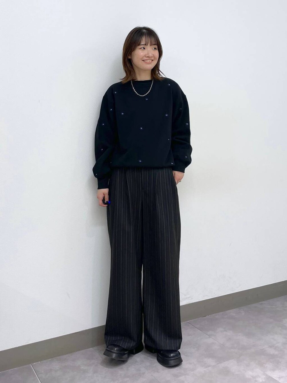 オールブラックコーデ🖤 【トップス】 さりげないお花の刺繍が可愛いスウェット🌼 丈感長すぎないのでワイドボトムとの相性◎です! シンプルに合わせしやすいシルエットとデザインで着回し力抜群です^ ^ 【ボトムス】 ピンストライプが上品な印象のワイドスラックス すとんと落ちる質感と腰回りのタックでシルエットがとても綺麗です✨ フリーサイズで丈感しっかり長めでした ⭐︎着用アイテムはスクロール⬇️してチェック⭐︎