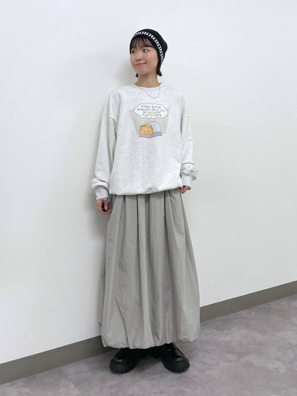 【トップス】 ガーフィールドのプリントが可愛いスウェット♡ 全体的にゆったりサイズで、裾のリブでふわっとするシルエットがこなれ感でお洒落^ ^ 【ボトムス】 トレンドのバルーンスカート!甘めな印象になりやすいバルーンスカートですが、グレーは大人っぽく着れるので私も着やすかったです! ウエストは総ゴムで楽に穿けました! ⭐︎着用アイテムはスクロール⬇️してチェック⭐︎