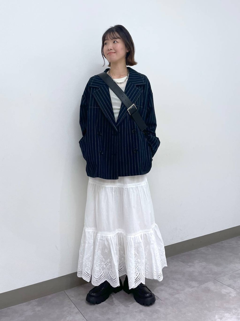 【ジャケット】 ピンストライプ柄が大人っぽいゆったりジャケット! 身幅や腕回りは広めですが着丈は長すぎないのでフレアスカートと合わせてもゆるっとしすぎないのが嬉しい🤝🏻 襟が大きめデザインなので小顔効果も◎ カジュアルアイテムとの相性も良いです👍🏻 【ボトムス】 コットンレースで柔らかい素材感🎀 切り返しデザインで、足元がふわっとするシルエットです。腰回りはすとんとすっきり落ちるので着痩せ効果◎ 白は透け感が少し気になったので、ペチコートなどを履くか、オーバーサイズのトップスで腰回りを隠すのをお勧めします! ⭐︎着用アイテムはスクロール⬇️してチェック⭐︎