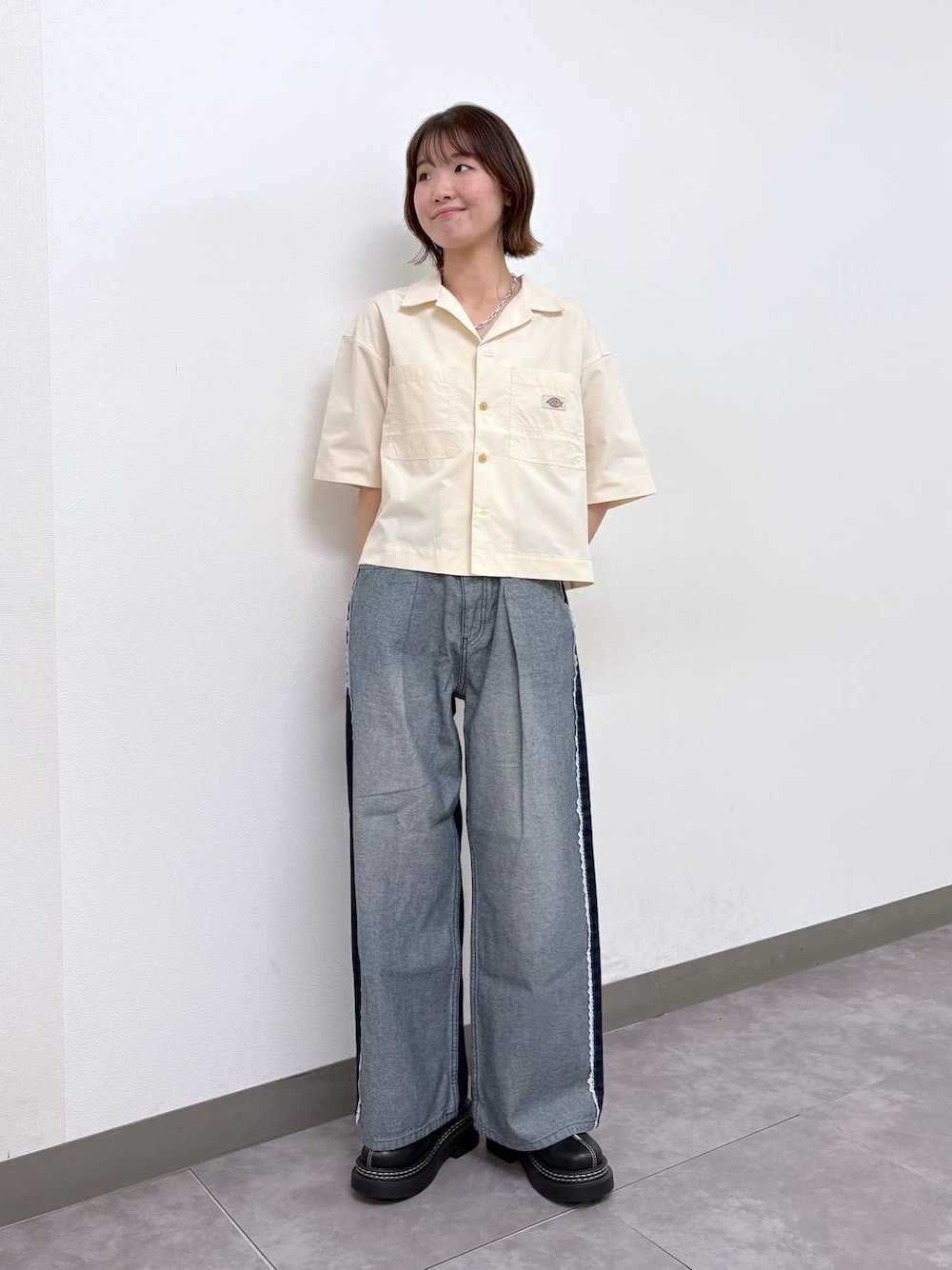 【トップス】 ディッキーズの短丈シャツ⭐️ 開襟デザイン&短丈ですっきりした印象で着れます! 薄手ですが程良く張り感があってカジュアルアイテムとの相性◎ 袖長めなので二の腕カバーもしてくれます! 【ボトムス】 サイドのレースラインがポイントで、前後で印象が変わるデニムパンツ👖 腰回りにはタックが入っているので、ワイドですが腰からのシルエットがとっても綺麗です! 身長164cmでMサイズ着用です。 ⭐︎着用アイテムはスクロール⬇️してチェック⭐︎