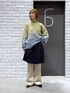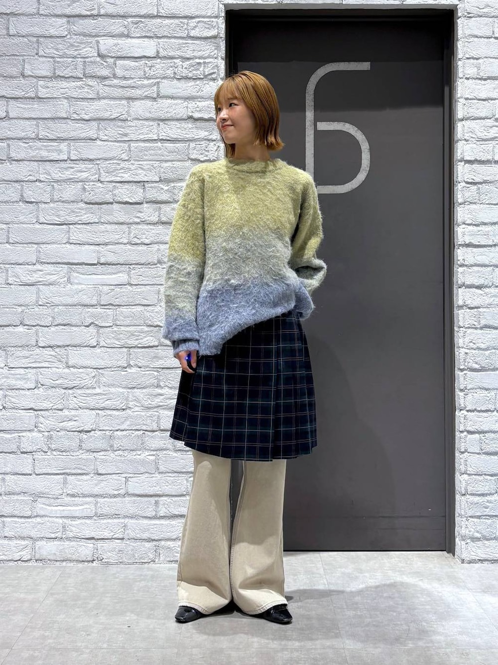 グラデーションニットはぼかし風のデザインなので柄アイテムとの合わせも◎! オーバーサイズの裾からミドル丈のチェックが見えるのがポイントで可愛い🌿