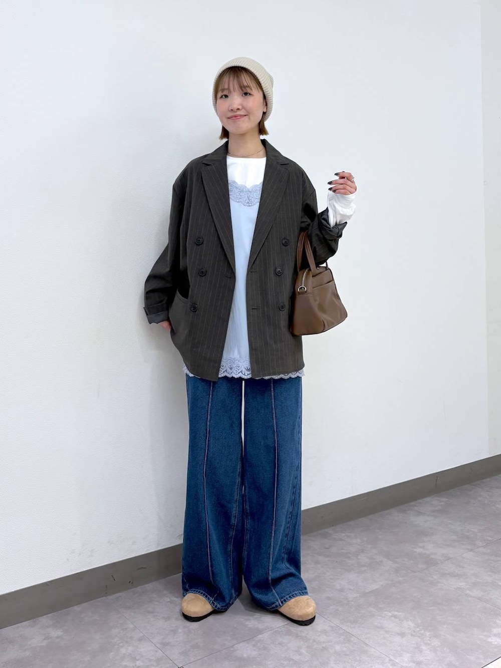 男女問わず着れるダブルジャケット✨ Sサイズから展開があるので女性でも着られてる感なく羽織れます◎ 細めのストライプ柄は品のある印象で、あえてカジュアルなアイテムと合わせるのがこなれ感🆙でおすすめ! ⭐︎着用アイテムはスクロール⬇️してチェック⭐︎