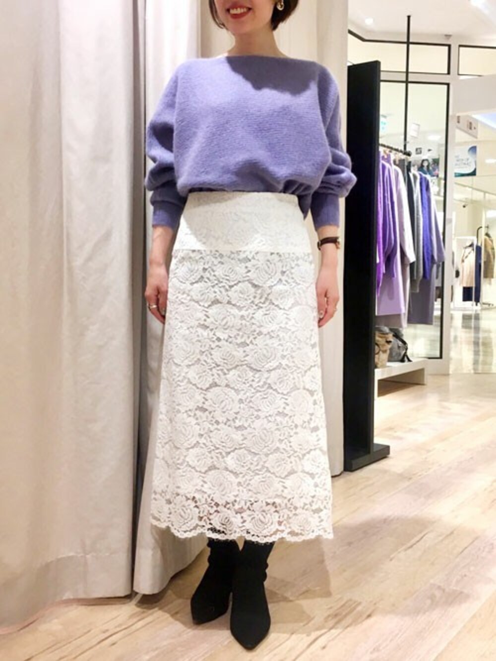 ふんわりニットはアンゴラで暖かく今の時期にぴったりです。 白のタイトスカートでさわやかなカラーでまとめるのがおススメです!