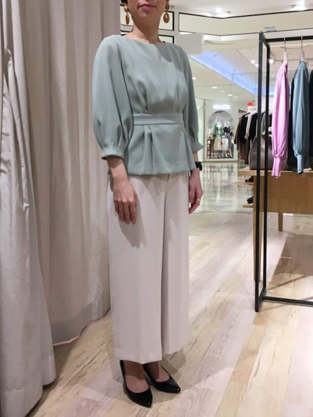 キレイなミントカラーが顔まわりを明るくしてくれるブラウス。 同素材のパンツで上品にまとめました。